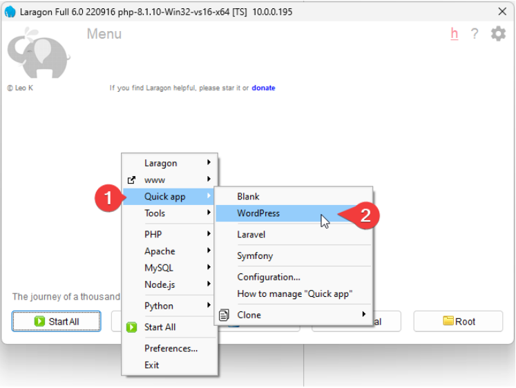 - Create a Project: Laragon makes it easy to create new projects. Click on the “www” menu in the Laragon dashboard, then select “Quick app” to create a new project. You can choose from various pre-configured applications like WordPress, Laravel, Symfony, etc., or create a custom project. In this example we are going to choose to install a WordPress Site.